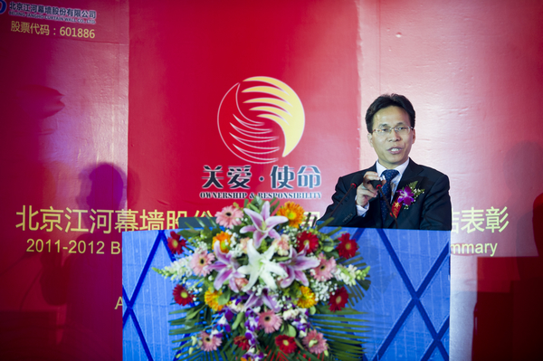 刘董事长表示,江河幕墙2011年的辉煌是全球江河人共同努力付出的成果。刘董事长在大会上对获奖的团体和个人表达了热烈祝贺,对全体江河人的辛勤付出鞠躬致谢并向全体家属致以节日问候!